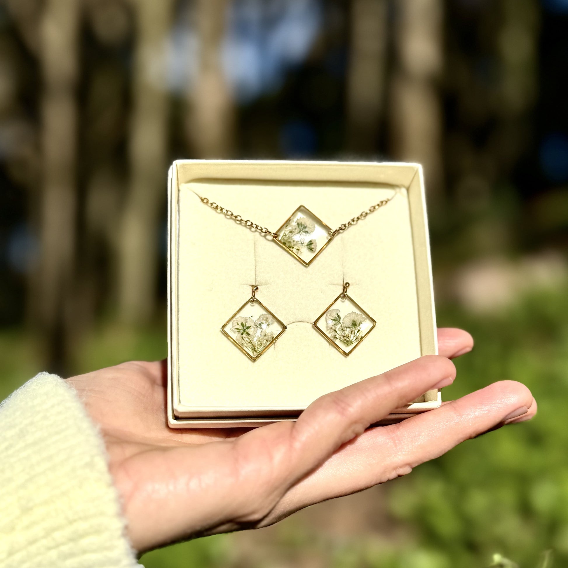 Todas as nossas joias são feitas à mão com flores secas reais, resina e aço inoxidável! Cada peça é única e feita para durar para sempre!